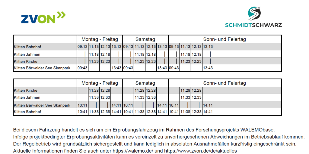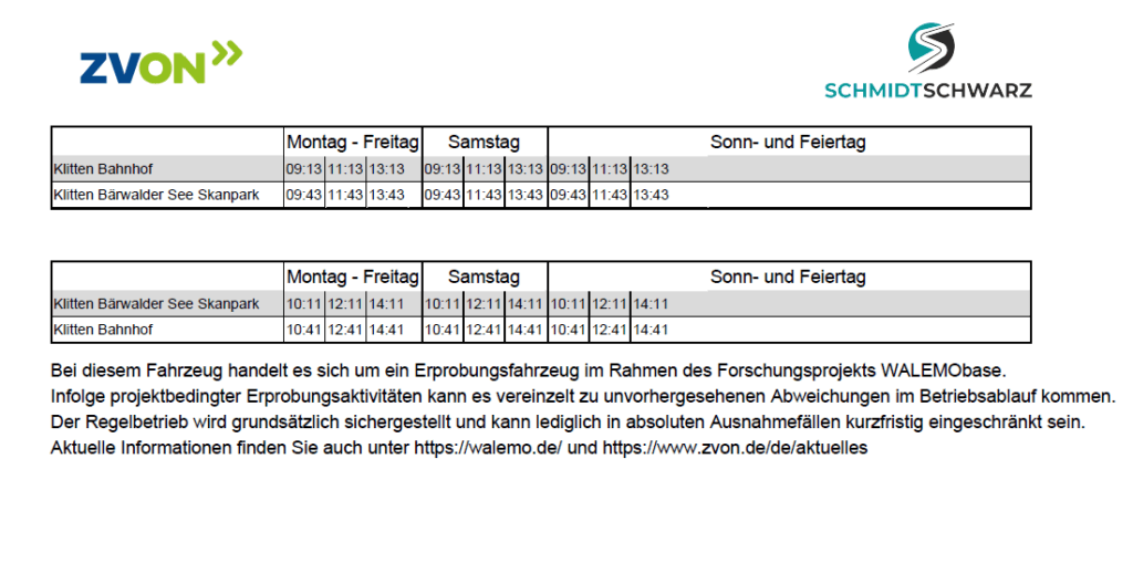 Das elektrisch betriebene Fahrzeug wird bis zum Ende des Projekts im Regelbetrieb zwischen Klitten Bahnhof und Klitten Hafen im Landkreis Görlitz eingesetzt – automatisiert, umweltfreundlich und für die Fahrgäste kostenlos.